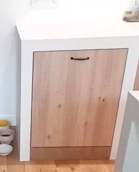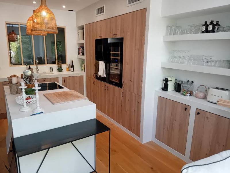 Sur les photos, on découvre une cuisine élégante composée de meubles en bois clair, associés à un plan de travail blanc épuré. Chaque élément a été soigneusement ajusté pour garantir un rendu esthétique et durable.
